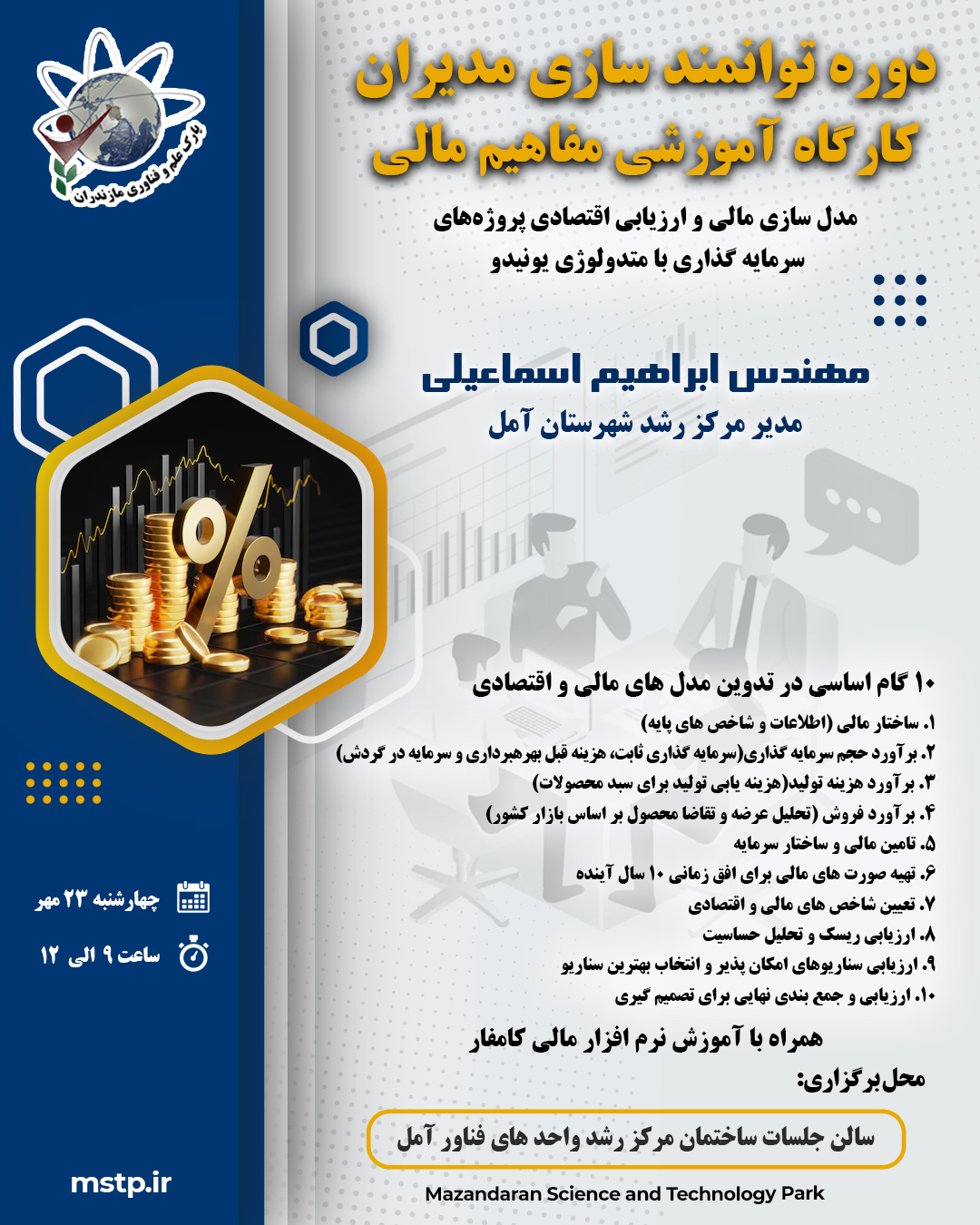 پارک علم و فناوری مازندران از مدیران واحدهای فناور دعوت مینماید تا با حضور در این کارگاه تخصصی، دانش مالی خود را ارتقاء داده و در مسیر توسعه اقتصادی و جذب سرمایهگذاری گامهای مؤثری بردارند.