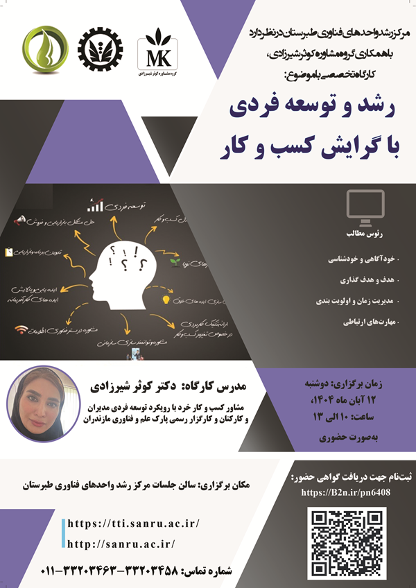 به اطلاع میرساند مرکز رشد واحدهای فناوری طبرستان با همکاری گروه مشاوره کوثر شیرزادی در نظر دارد کارگاه تخصصی با عنوان: «رشد و توسعه فردی با گرایش کسبوکار» را بهصورت حضوری برگزار نماید.