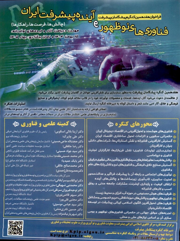 هفدهمین کنگره پیشگامان پیشرفت با موضوع “فناوریهای نوظهور و آینده پیشرفت ایران” بهار ۱۴۰۵ برگزار میشود. علاقهمندان میتوانند مقالات خود را تا ۱۵ بهمن ۱۴۰۴ در سایت کنگره ثبتنام و ارسال کنند.