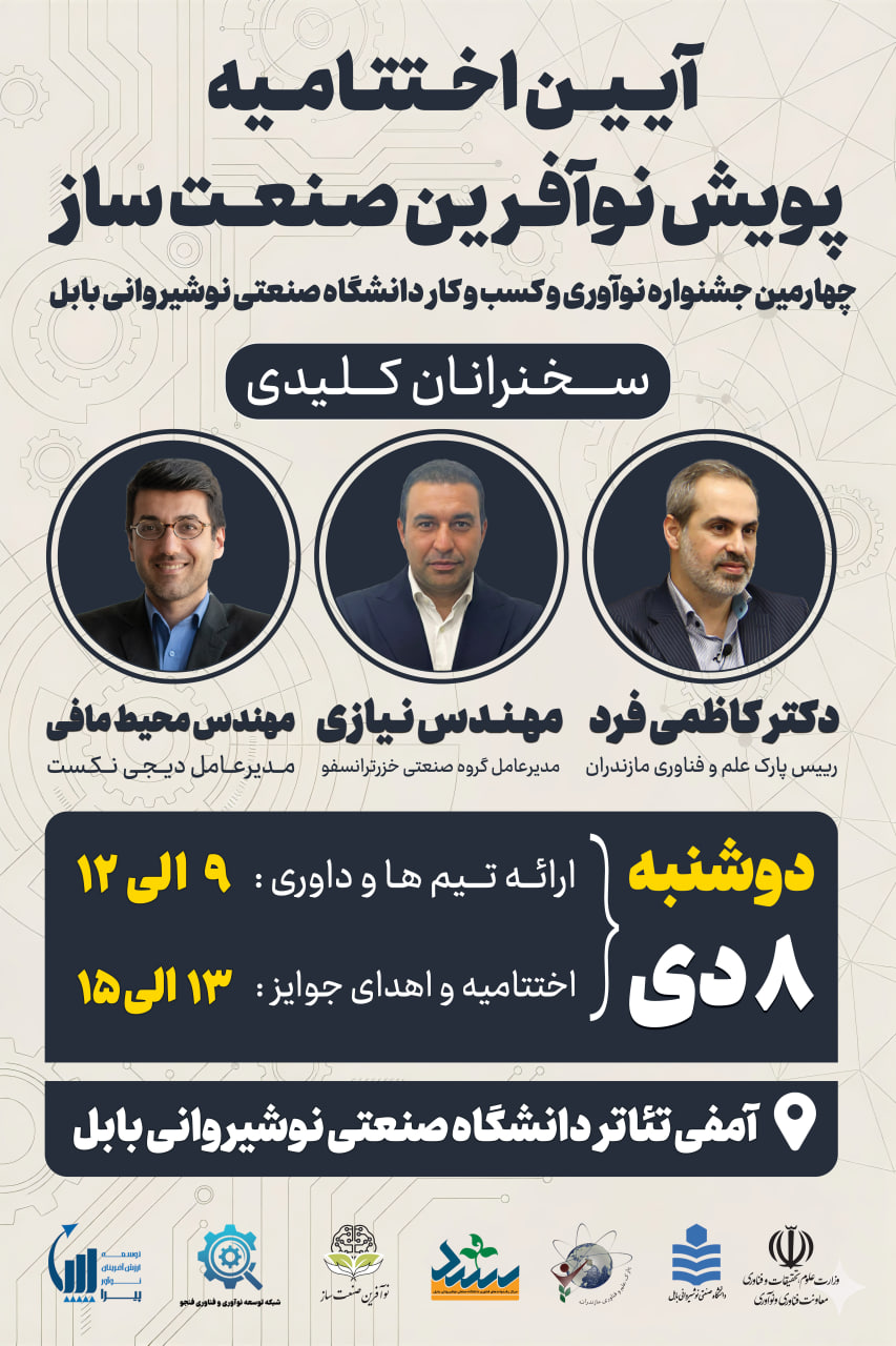 به گزارش روابط عمومی پارک علم و فناوری مازندران، چهارمین جشنواره نوآوری و کسبوکار دانشگاه صنعتی نوشیروانی بابل با همکاری پارک علم و فناوری مازندران برگزار میشود و آیین اختتامیه این پویش در روز دوشنبه ۸ دیماه در آنفیتئاتر دانشگاه برگزار خواهد شد.