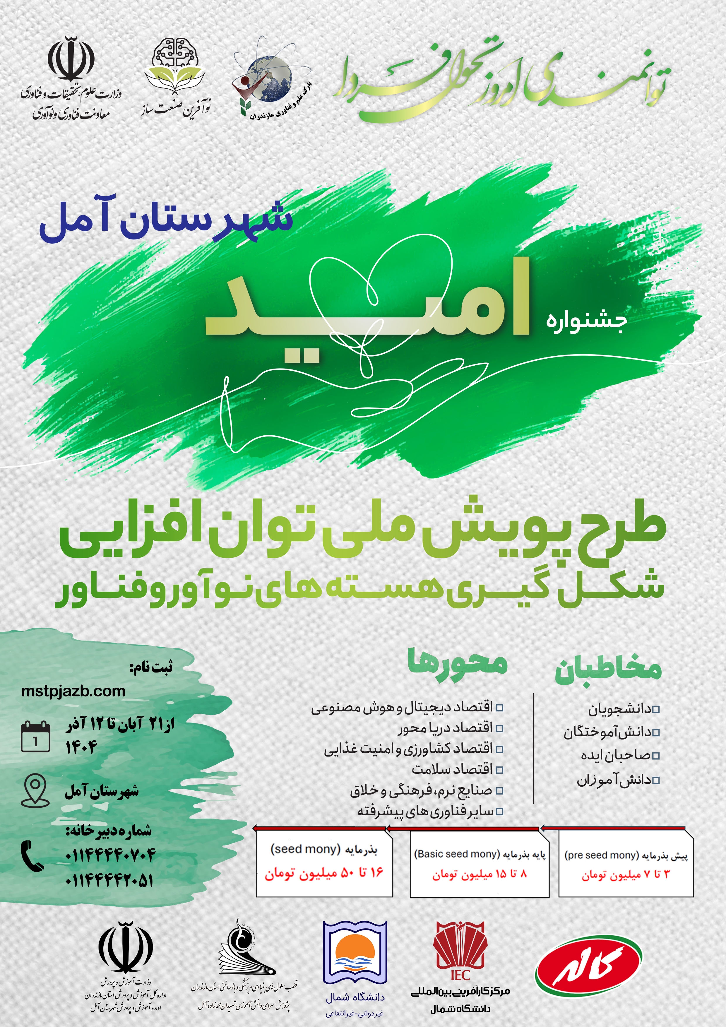 این جشنواره با حمایت پارک علم و فناوری مازندران و با تمرکز بر پذیرش ایدهها برای شکلگیری هستههای فناور و نوآور در زیستبوم نوآوری استان طراحی شده است.