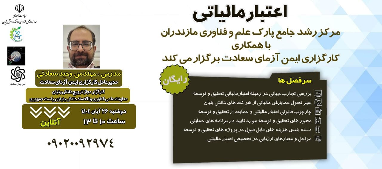 به گزارش روابط عمومی پارک علم و فناوری مازندران، مرکز رشد جامع پارک با همکاری کارگزاری ایمن آزمای سعادت، دوره آموزشی تخصصی با عنوان «اعتبار مالیاتی» را به صورت آنلاین و رایگان برگزار مینماید.