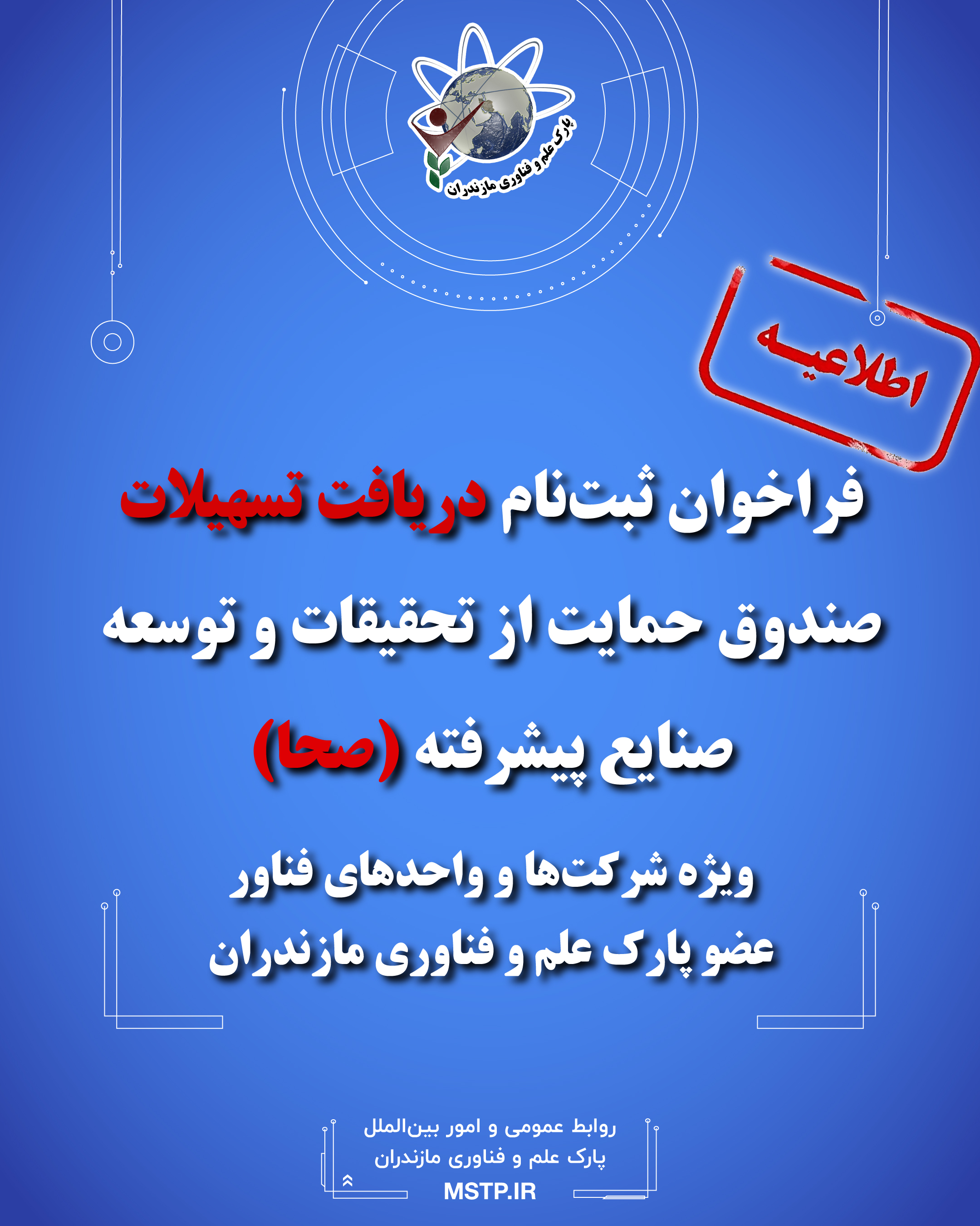پارک علم و فناوری مازندران به اطلاع شرکتها، واحدهای فناور و فعالان حوزه صنایع پیشرفته میرساند که فرآیند ثبتنام برای دریافت تسهیلات صندوق حمایت از تحقیقات و توسعه صنایع پیشرفته (صحا) در جریان است و مهلت ثبتنام تا ۱۵ دیماه تعیین شده است. این فراخوان ویژه شرکتها و واحدهای فناور عضو پارک علم و فناوری مازندران میباشد. صندوق صحا با هدف پشتیبانی از توسعه فناوریهای نوین، ارتقای تولید داخلی و گسترش صادرات، بستههای متنوعی از خدمات مالی و حمایتی را در اختیار متقاضیان قرار میدهد.